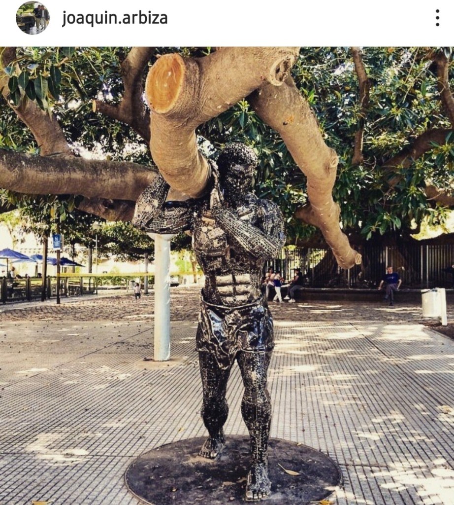 The work was inaugurated in 2014. It was offered to the city by its creator and represents the legendary titan of Greek mythology who carries on one of his shoulders a heavy branch of the monumental rubber tree. Recoleta’s Atlas is 1.85m tall, weighs around 250kg and rests on a circular iron base. It is made up of more than three thousand car parts, welded and assembled. It was the artist Arbiza who moved it. First in his truck, then by boat.
